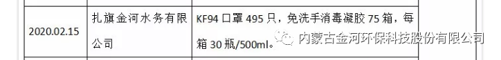 扎旗金河水务在了解扎赉特旗政府抗疫物资紧缺情况后,迅速汇报,公司总经理田中宏连夜紧急求助山东良福制药公司,该公司克服困难,加班加点、超负荷生产,一天内将2800瓶免洗手消毒凝胶生产出来,并经过重重运输困难,于2月15日将2500瓶消毒凝胶及时送达扎赉特旗应急局。公司又把原采购的700个KF94用于员工防控的口罩,拿出500个安排专人也同时送到扎旗政府。